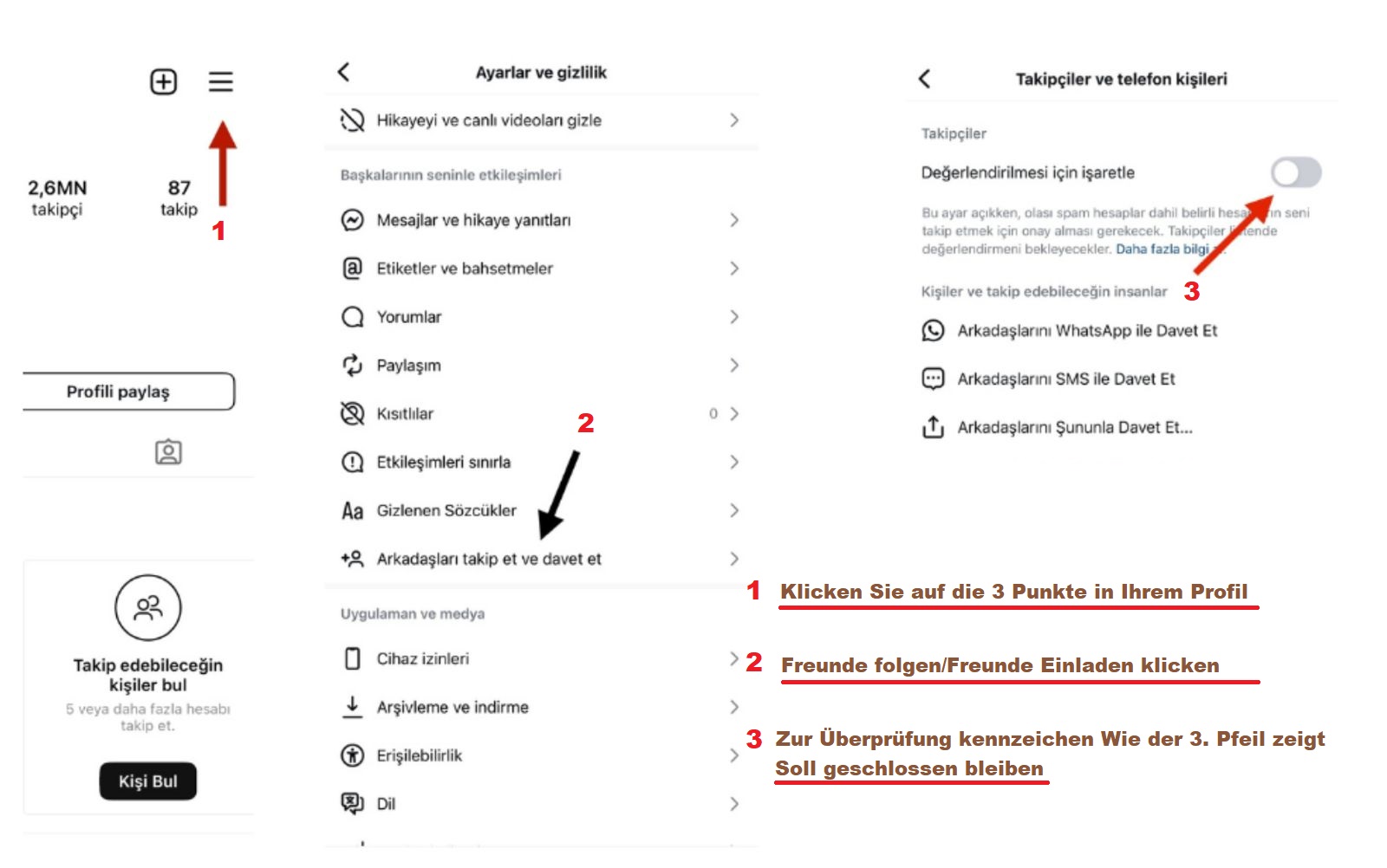 • Dies ist erforderlich, damit neue Follower automatisch zu Ihrer Follower-Liste hinzugefügt werden. Wenn Sie diesen Schritt nicht ausführen, werden neue Follower im Ordner „Zur Überprüfung markiert“ abgelegt. Andernfalls werden alle neuen Follower zur Überprüfung markiert und sind erst nach Ihrer manuellen Freigabe in Ihrem Konto sichtbar. Klicken Sie dazu auf die drei Punkte und wählen Sie „Kein Spam“ oder „Nicht relevant“.